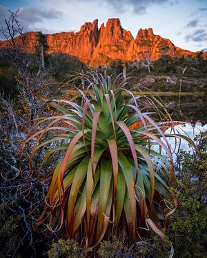 Tarn-side Pandani set against the glowing orange dolerite of Mt Geryon's jagged ridgeline. Few scenes are more iconic of the Tasmanian Wilderness experience.