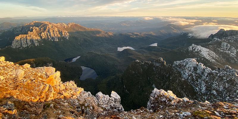It was a race against the evening light from Tahune Hut to the summit of Frenchmans Cap. The sweat and burning in my lungs were worth it. As the sun slowly buried itself into the Indian Ocean, the Tasmanian Southwest Wilderness was set ablaze in an ethereal orange light. Philps Peak and Agamemnon glow as cool mist travels up the valleys around Clytemnestra.